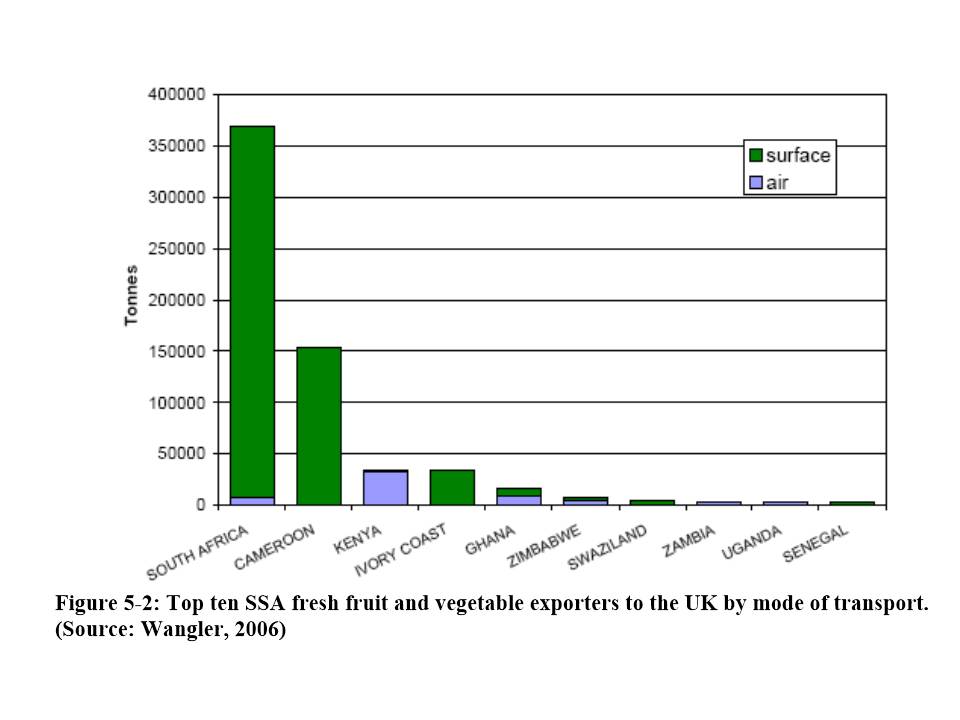 สลิ่มอำมาตย์จ๋า ประเทศในอัฟริกา ส่งผักสดผลไม้ไปประเทศอังกฤษ ด้วยปริมาณมหาศาล อ่านกราฟเป็นไหม แกนทางซ้าย คือ ตัวเลขบอกปริมาณส่งออกผักสดผลไม้ จะเห็นชื่อ 10 ประเทศทางแกนนอน แกนสีเขียว คือ ขนส่งทางเรือ สีม่วงคือ การขนส่ง ทางอากาศ ประเทศเหล่านี้ สามารถส่งผักผลไม้สด ย้ำ ผักผลไม้สด ย้ำอีกที ผักผลไม้สด ไปต่างประเทศ เป็นการนำเงินตราเข้าประเทศ