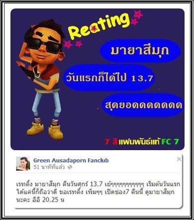ละครสนุกในแบบร้องเล่นเต้นรำแบบนี้นานๆจะมี แต่อีกไม่นานเราจะได้ชมกันแล้ว ที่หน้าจอ 7 สี เชื่อฝีมือกรีนและเติ้ลค่ะ ต้องสนุกแน่นอน ขอชมกรีน....ประทับใจการแสดงกรีนมากในมายาสีมุก ออกฮาๆโก๊ะๆน่ารักดี อยากเ