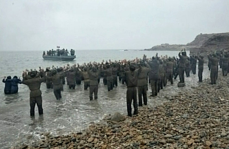 ทหารจากกองทัพเกาหลีเหนือกำลังโห่ร้องแสดงความเคารพและวิ่งลงไปยังท้องทะเลซึ่งเรือของผู้นำเกาหลีเหนือลอยลำอยู่