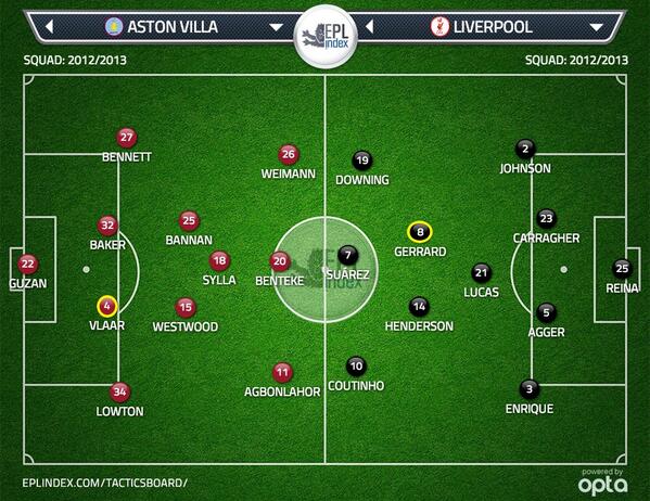 AVFC: Guzan, Lowton, Vlaar [c], Baker, Bennett, Westwood, Bannan, Sylla, Agbonlahor, Weimann, Benteke.