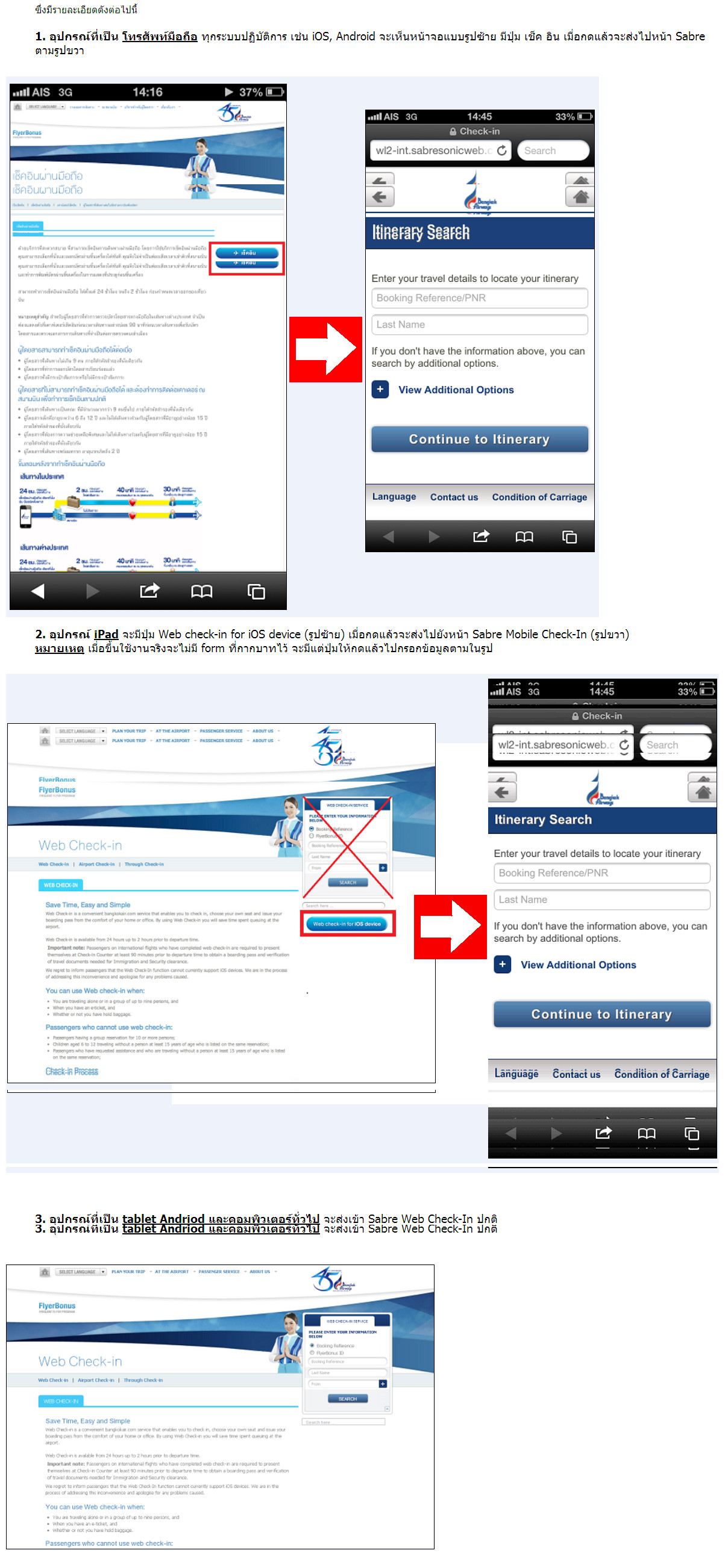 Bangkok Airways เปิดให้บริการ Check-in ผ่านโทรศัพท์มือถือ ตั้งแต่วันที่ 29 มีนาคม 2556 เวลา 09.00 น. Mobile Check-In ที่จะเปิดใช้นี้ เพื่อแก้ข้อจำกัดของ Web Check-In ที่แต่ก่อนไม่สามารถใช้ได้กับอุปกรณ์ที่เป็น iOS เช่น iPhone, iPad โดยไม่ต้อง Load Application แต่สามารถเข้าไปที่ WWW.BANGKOKAIR.COM ได้เลย