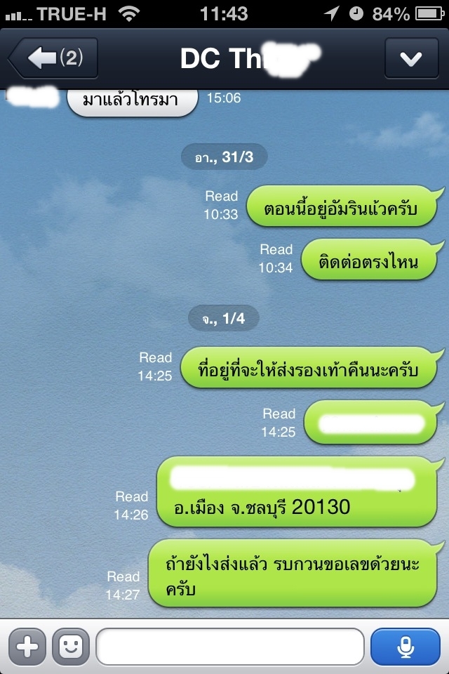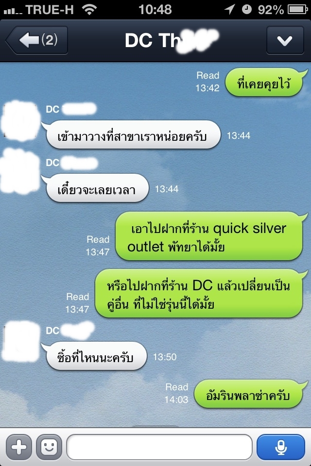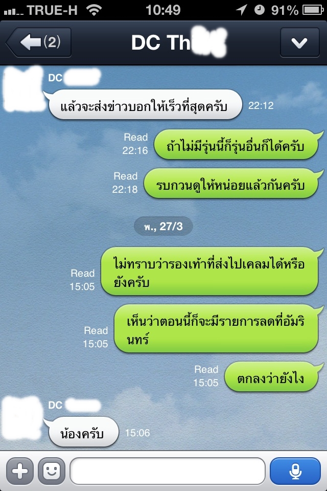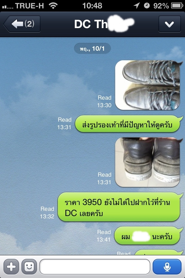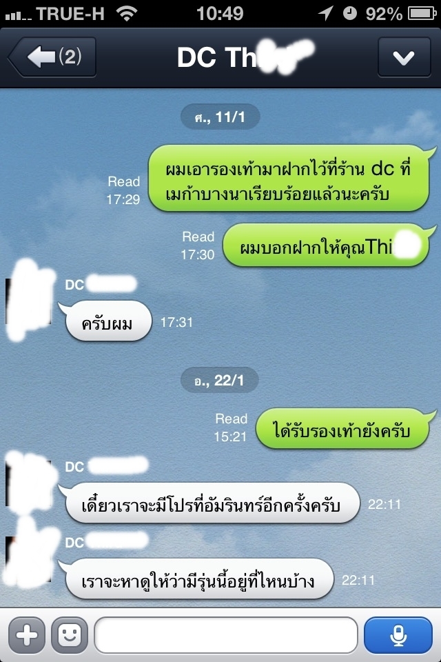 ผมก็ให้เบอร์โทรไปทาง inbox ของ DC Thailand 30 พฤศจิกายน 2012 เวลา 12:01น. จากนั้นก็มีเบอร์ 02 โทรมา แล้วก็ให้เบอร์มือถือไว้ ติดต่อกับคุณ ต. DC หลังจากนั้นจึงคุยกันทาง Line แต่ข้อความบางส่วนมันหายไปแล้วครับ ผมก็บอกไปว่าผมอยู่ชลบุรี ช่วงนั้นไม่ว่าง ยังไม่สะดวกเอารองเท้าเข้าไปให้ที่ กทม. ครับ ปล. รูปที่ copy มาได้เหลือแต่ของวันที่ 10-1 เป็นต้นมาแล้วครับ