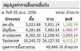 เว็บไซต์ตลาดหลักทรัพย์แห่งประเทศไทย รายงานสรุปการซื้อขายหลักทรัพย์ โดยแบ่ง ตามประเภทนักลงทุน ประจำวันที่ 26 ธันวาคม 2556 ดังนี้ กลุ่ม ปริมาณซื้อ % ปริมาณขาย % สุทธิ (ลบ.) (ลบ.) (ลบ.) นักลงทุนสถาบัน 4