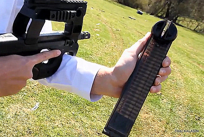 ปืนนายแบบสัปดาห์นี้ “บูล พัพ” (bullpup) ใช้โครงปืนเป็นพานท้ายให้ประทับไหล่ยิงได้แบบปืนยาว ลำกล้อง 18.5 นิ้ว เป็นระดับที่เรียกกันว่า ปืนปราบจลาจ