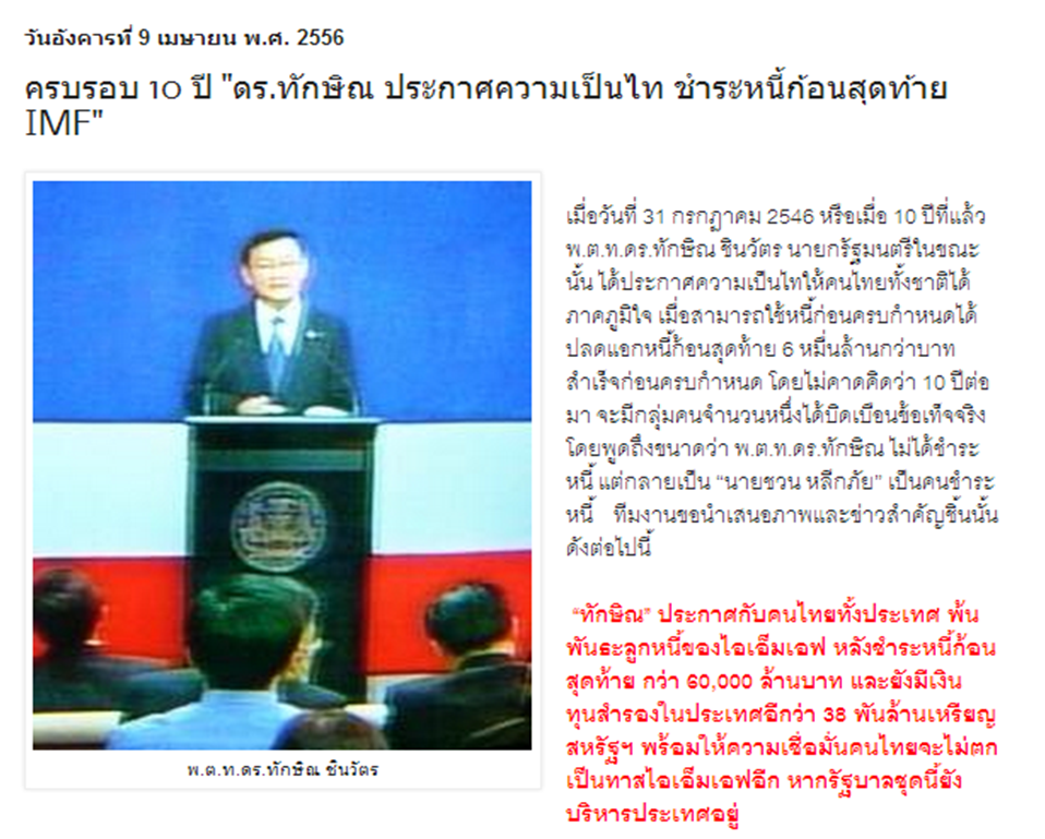 หลายคนคงได้รู้ความจริงเรื่อง นายกฯ ทักษิณ ใช้ความสามารถทางเศรษฐกิจ ใช้หนี้ IMF ได้อย่างรวดเร็วก่อนเวลา และ ก็มีบางคนบิดเบือนข้อเท็จจริง โดยการใช้วิธีที่เขาชอบทำอยู่บ่อยๆ ... ... คือ ... ใส่ร้ายผู้อื่น