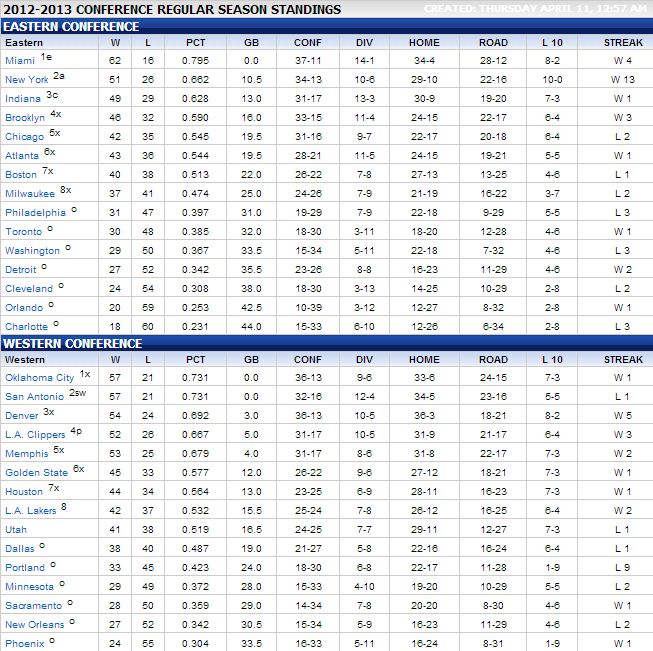 ดูจากตารางคะแนนทั้งตะวันออก แล้วก็ตะวันตก พบว่าทีมอันดับ 1 นี่แพ้เยอะมากนะครับ(ยังไม่ถึงครึ่งฤดูกาลเอง แต่แพ้กันไป10เกมส์ละ) ถ้าสถาณการณ์ยังเป็นแบบนี้คิดว่าน่าจะลุ้น play off, play in รวมถึงอันดับ see