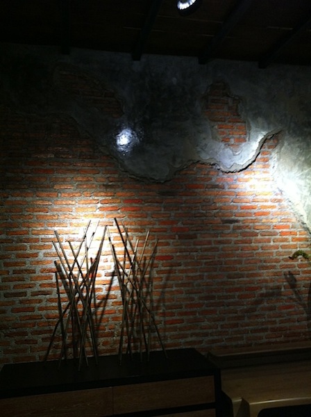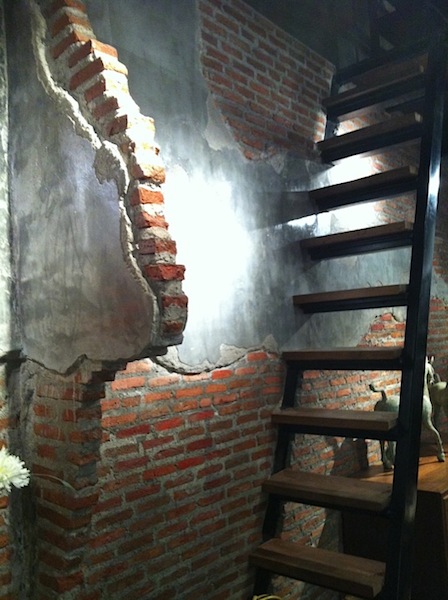 มีการก่ออิฐกั้น เหมือนซากโบราณสถาน ผมเห็นเเล้วทึ่งในไอเดียเเละความสามารถของช่างกลุ่มนี้มาก เจ้าของร้านบอกว่าใช้เวลาทำเป็นอาทิตย์เลยครับ ตอนทำก็คลุมผ้าไว้มิดชิดจนไม่เห็นว่าช่างขั้นเทพเค้าทำยังไง ถึงได้ออกมาเป็นแบบนี้