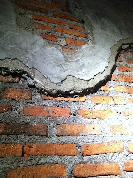 ดูแล้วเหมือนกับการก่อปูนขัดมันบนผนังอิฐมอญ แล้วมีการสกัดเป็นชั้นๆ