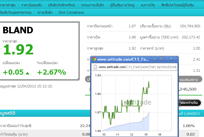 หุ้นลูก bland w-2 จะเข้าซื้อขายบนกระดาน วันที่ 15 พ.ค. 56 นี้ แต่มันติดกับวันที่ 16 พ.ค. 56 วันที่งบ Q1 ออกพอดี จะเป็นไปได้ใหมครับ ที่ราคา bland จะยังไม่ตกง่ายๆ ถึงแม้ว่าหุ้นลูกจะเข้าซื้อขายบนกระดานวั