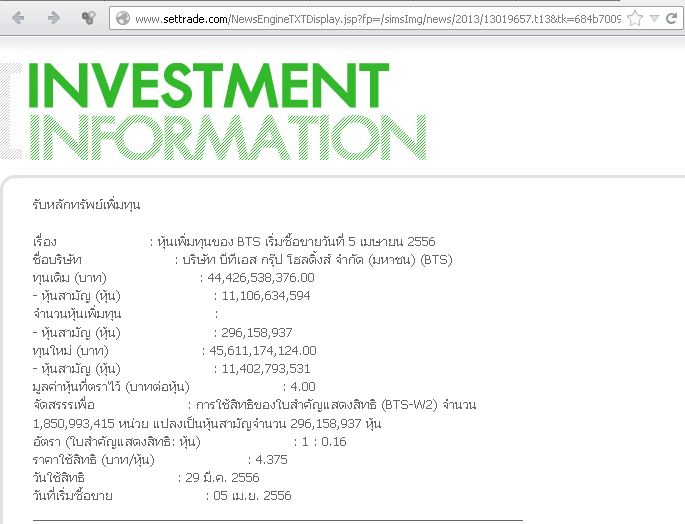 BLAND ออก ลูก W-4 ฟรี แปลง w-2 จะมาทันรึป่าว ? อัตราส่วน (หุ้นเดิม : หลักทรัพย์แปลงสภาพ) : 2.59 : 1 วันที่ไม่ได้รับสิทธิซื้อหลักทรัพย์แปลงสภาพ : 16 พ.ค. 2556 ราคาตอนนี้ 50 / 50 ต่อการตัดสินใจมากจะอ