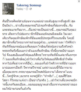 “จะของดแสดงความคิดเห็นทางการเมืองชั่วคราว จนกว่าจะได้ความกระจ่างจากประชาธิปัตย์ ว่าพวกเขาไปพบทักษิณเรื่องอะไร เจรจาอะไรกัน ทำเพื่อประโยชน์ของประเทศชาติและประชาชน หรือเพื่อประโยชน์ของพวกประชาธิปัตย์ เพราะอ่านเจอในเฟซบุ๊ก สมศักดิ์ เทพสุทิน บอกว่านักการเมืองฝ่ายตรงกันข้ามกับรัฐบาล (ซึ่งก็น่าจะหมายถึงประชาธิปัตย์) ไปพบทักษิณบ่อยกว่าเขาอีก ข้อกล่าวหานี้ประชาธิปัตย์จะตีลูกเซ่อทำเฉยๆ ไม่ได้ ต้องออกมาชี้แจง ถ้าหากไปคุยกันเพื่อบ้านเมือง เพื่อประชาชน เราก็ยินดีสนับสนุน บ้านเมืองจะได้ปรองดองกันเสียที แต่ถ้าไปคุยกันเพื่อตกลงกัน เป็นเรื่องผลประโยชน์ของนักการเมือง พวกเราคงต้องคิดอ่านว่าเราจะให้นักการเมืองทำงานเพื่อประชาชนได้อย่างไร ต้องยอมรับว่าที่ประเทศไทยอยู่ในสภาพที่คะแนนตกต่ำไปทุกๆ ด้านทุกวันนี้ ก็เพราะพฤติกรรมของนักการเมืองที่เอาวาระส่วนตัวอยู่เหนือวาระแห่งชาติ