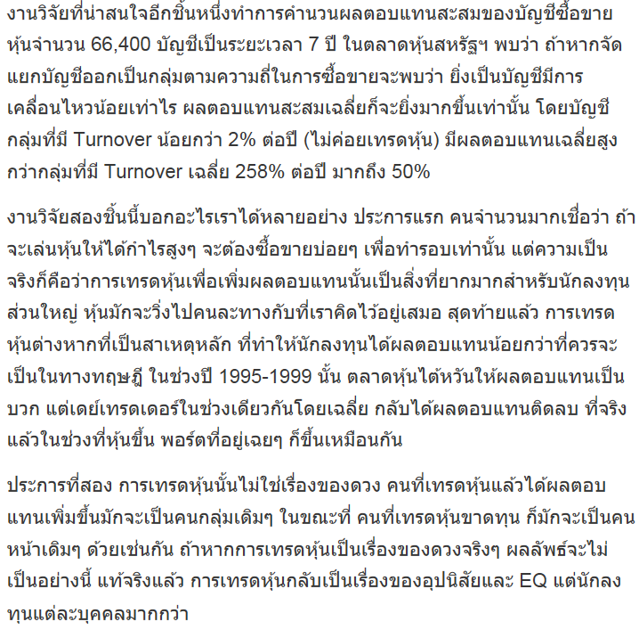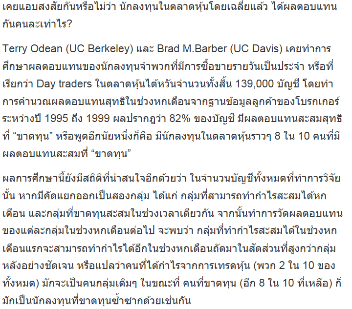 ปล. ย้อนมาดูตัวเรากันครับ เราอยู่ตรงไหน สำหรับผมตั้งแต่ปีแรกของการลงทุน ยังโชคดีครับ ลงทุนในช่วงตลาดขาขึ้น ยังจัดอยู่ในกลุ่มคนที่กำไรครับ ระยะยาวยังอีกไกล ต้องมาดูกันอีกทีว่า เรายังจะกลายเป็นกลุ่มคนที่สำเร็จหรือล้มเหลวซ้ำซากอยู่อีกหรือปล่าว หากยังไม่เปลี่ยนพฤติกรรม