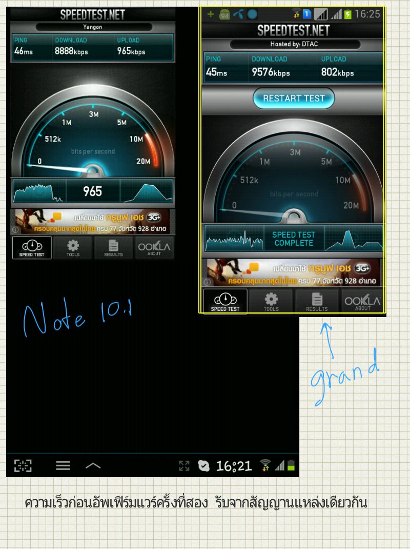 **จนกระทั่งfwตัวที่2ปล่อยออก (ได้อัพวันที่ 8 เมษา) มาก็กดอัพไป .. ช่วงนั้นรู้สึกว่าเล่นwifiผ่านgrandแล้วหลุดบ่อย แต่ไม่เอะใจเพราะnote10.1ก็หลุดเหมือนกัน //เน็ตคงเน่าละมั้ง เพิ่งมาเอะใจเมื่อวานเล่นเน็ตผ่าน grand หลุดบ่อยมากเลยเปลี่ยนไปเล่นในnote10.1 เน็ตแทบไม่หลุดเลย ก็เลยเอะๆยังไงกันเนี้ย เลยลองเทสสปีดดูปรากฏว่าห่างกันถึงครึ่ง ครั้งนี้ก็เลยเอากล้องมาถ่าย จับสัญญานแหล่งเดียวกันค่ะ เวลาเดียวกัน ได้สัญญานออกมาแบบนี้