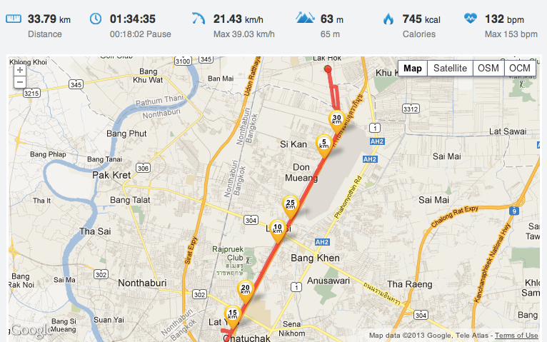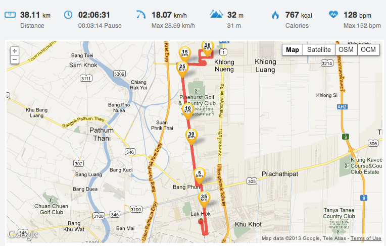 แล้วกลับทางเดิม รวมระยะทาง 38.11 km ใช้เวลาสองชั่วโมงหกนาที ไม่รวมพักตามทางประมาณสิบห้านาที
