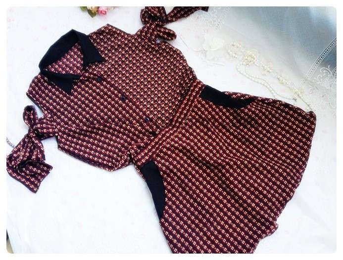 เสื้อคอปก สีดำ ตัวเสื้อลายแดงเลือดหมู กระดุมผ่าด้านหน้า เปิดไหล่ มีโบว์