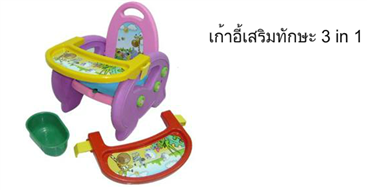 ใช้สำหรับให้เด็กฝึกนั่ง ไม่ว่าจะนั่งเล่น นั่งอาบน้ำ สารพัดประโยชน์สุด ๆ , มีถาดสำหรับวางจาน ชาม หรือ วางของเล่น ช่วยฝึกพัฒนาการในด้านการทานอาหาร ไม่ต้องคอยตามป้อนค่ะ ตัวถาดมีที่ล็อคสองข้าง กันน้องตกจากเก้าอี้ อุปกรณ์แข็งแรงค่ะ และถาดสามารถถอดออกได้ด้วยค่ะ , เมื่อเปิดแผ่นรองนั่งขึ้นมาด้านล่างจะเป็นกระโถน ไว้ฝึกการขับถ่าย และสามารถถอดทำความสะอาดได้ง่ายค่ะ เก้าอี้นี้อาจเริ่มให้น้อง ๆ ได้ฝึกนั่งกันค่ะ หรือสำหรับน้องอายุ 6 เดือน ขึ้นไปที่เริ่มหัดตักข้าวทานเอง และเริ่มฝึกขับถ่าย สามารถรับน้ำหนักได้ถึง 30 กิโลกรัมค่ะ