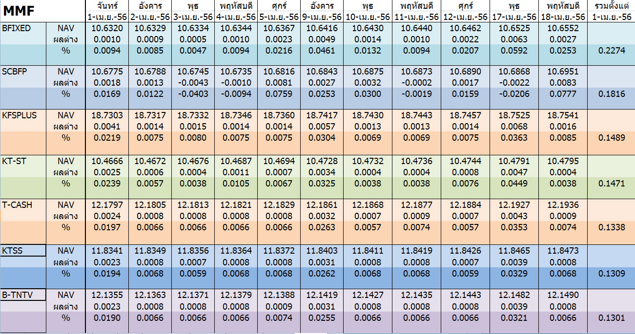 ราคาวันนี้ดูที่ช่อง 18 เม.ย. 56 นะคะ   ช่องสุดท้ายเป็น รวมผลตอบแทน ตั้งแต่ 7 มี.ค. เป็นต้นมาถึงวันนี้