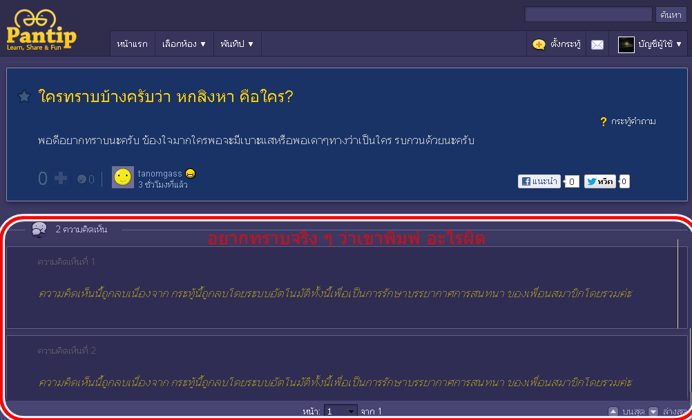 พอดี จขกท ตั้งกระทู้ แล้วมีคนมาแสดงความคิดเห็น แต่โดนพันทิปลบอัตโนมัติคะ จขกท อยากอ่านว่าเขาเม้นอะไร อิอิ เปิดอ่านไม่ทัน!!