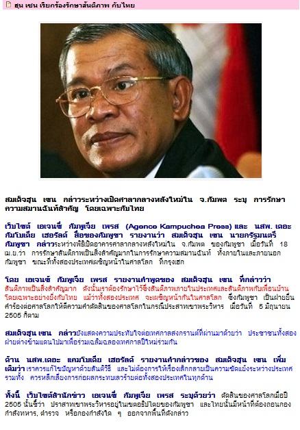 ยิ่งมาดูจากคำให้สัมภาษณ์ สมเด็จฮุนเซนแล้วเป็นไปไม่ได้เลย ที่จะมีการรบกัน ของระหว่างสองประเทศนี้ในยุครัฐบาลยิ่งลักษณ์ และ ตามความคิดดิฉัน ศาลคงไม่ตัดสินให้เกิดความวุ่นวาย หรือ ให้มีสงคราม ขึ้น