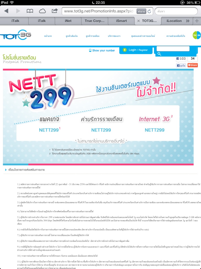 เงื่อนไข ต้องเป็นลูกค้าของ TOT อยู่ก่อนแล้ว , ใช้ความเร็ว 3G ได้ 2GB จากนั้นปรับความเร็วเหลือ 384Kbps , ไว้สำหรับใช้งาน 3G ไม่สามารถโทรเข้าออกได้ ข้อมูลเพิ่มเติม http://www.tot3g.net/PromotionInfo.asp