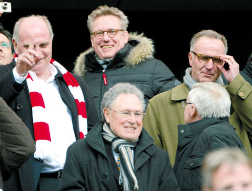 อูลี่ เฮอเนส (ซ้าย) ประธานสโมสรบาเยิร์น และ คาร์ล ไฮนซ์ รุมเมนิกเก้ (ขวา) ซีอีโอของทีมมากันพร้อมหน้าพร้อมตาในเกมนี้