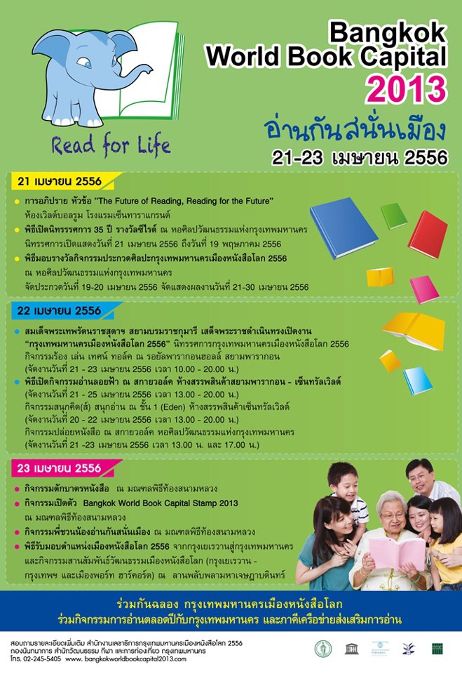 สวัสดีคะ ^_^ พอดีได้มีส่วนร่วมในกิจกรรม อ่านกันสนั่นเมือง กรุงเทพมหานครเมืองหนังสือโลก 2556 เลยมาขอแนะนำ เพื่อมีคนที่จะสนใจ ใครมีอะไรสงสัย แชร์คำถาม คำตอบได้นะคะ เริ่มที่กิจกรรมจะมีตั้งแต่วันพรุ่งน
