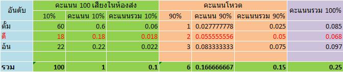 ตารางที่ 1 ตั้มได้คะแนนโหวต 90% มาเป็นอันดับสุดท้าย ดีได้ที่ 1 อ้นได้ที่ 2