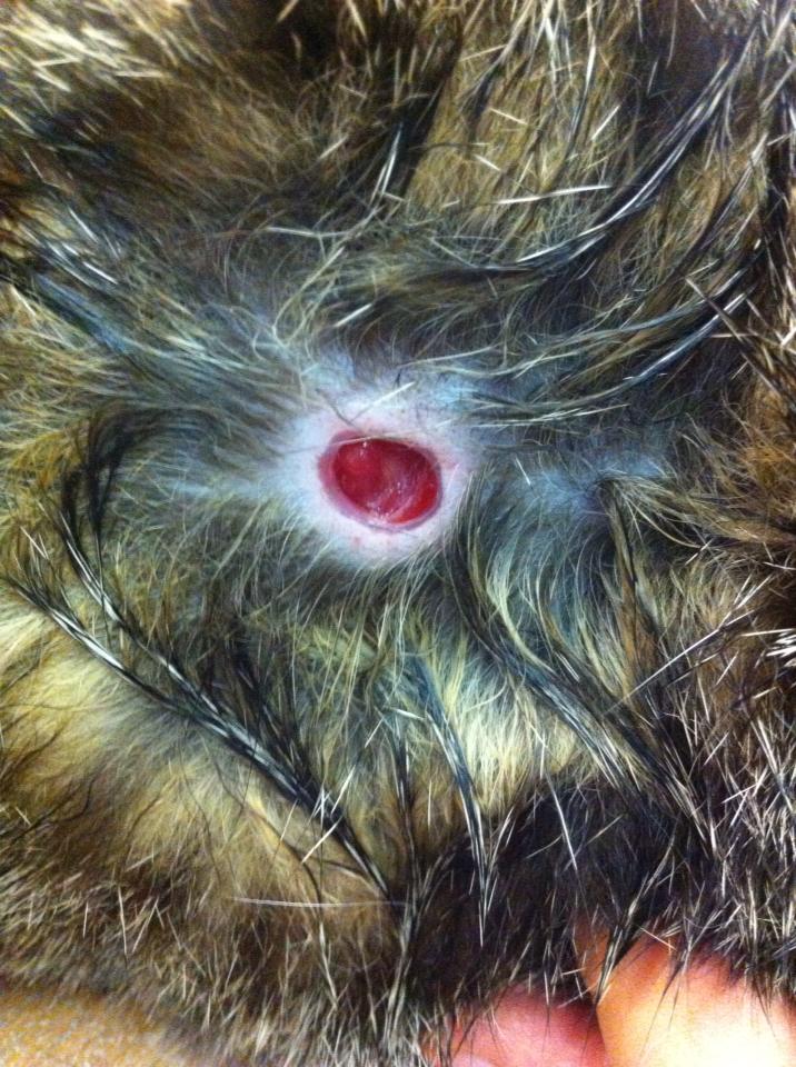 พอแตกก็เลยเป็นรูเช่นนี้ ถ้าปล่อยไว้อาจติดเชื้อได้....เห้อออออ...ปลาส้มนะแกล้งน้องอีกแล้ว
