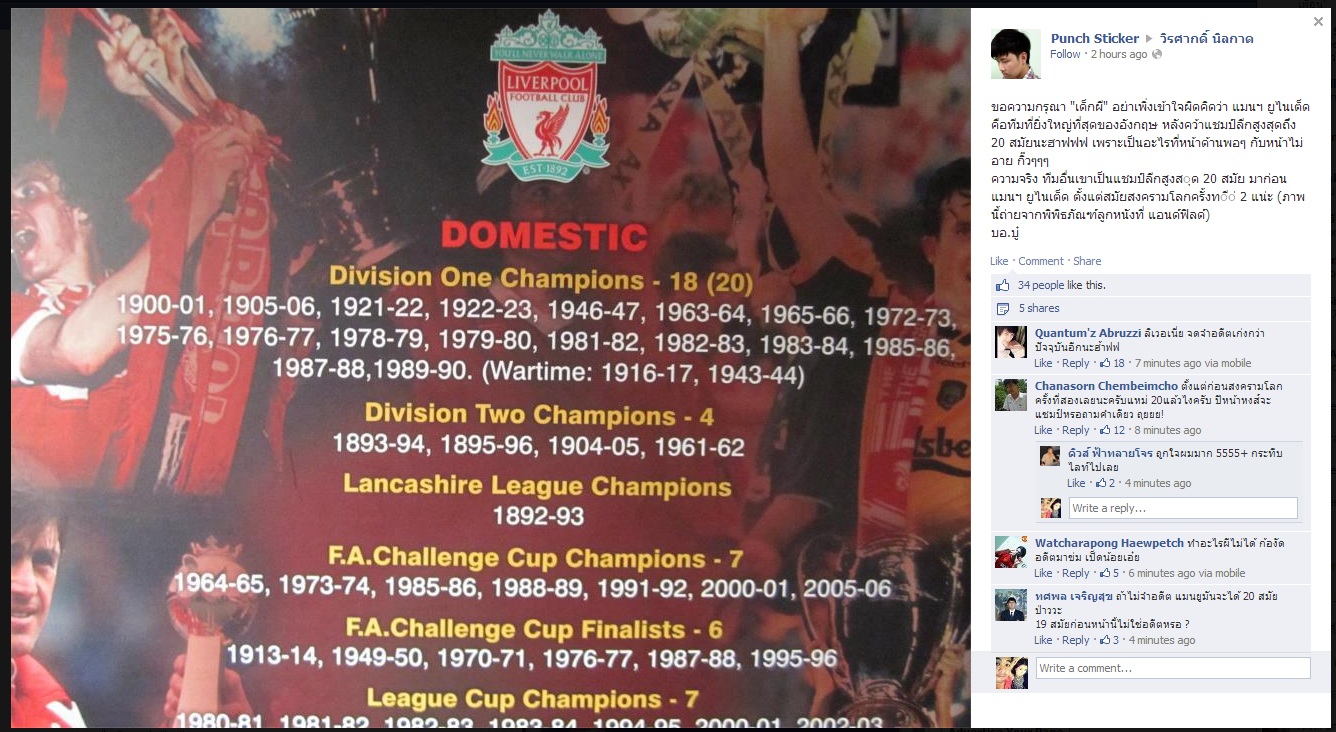 เฉพาะแฟนบอลลิเวอร์พูลที่เป็นเพื่อนในเฟส ถ้าทีมชนะ เขาจะโพสท์ใส่เสื้อ แชร์ไฮไลท์ ผลการแข่งขัน ถ้าทีมแพ้ หน้าเฟสจะไม่มีความเคลื่อนไหวอะไร ซึงถือว่าปกติ ต่างจากกแฟนบอลทีมอื่นๆ ถ้าทีมนั้นแพ้ จะอ้างโน่นนี่