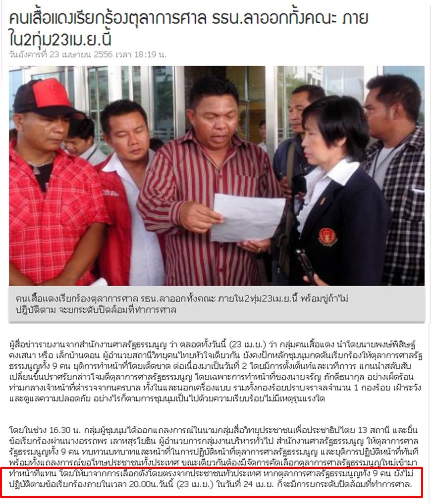**แดงเรียกร้องตุลาการศาล รธน.ลาออกทั้งคณะ ภายใน2ทุ่ม23เม.ย.นี้ : นี่จะ 4 ทุ่มแล้ว ขอทราบความคืบหน้าค่ะ (by แก้ม)