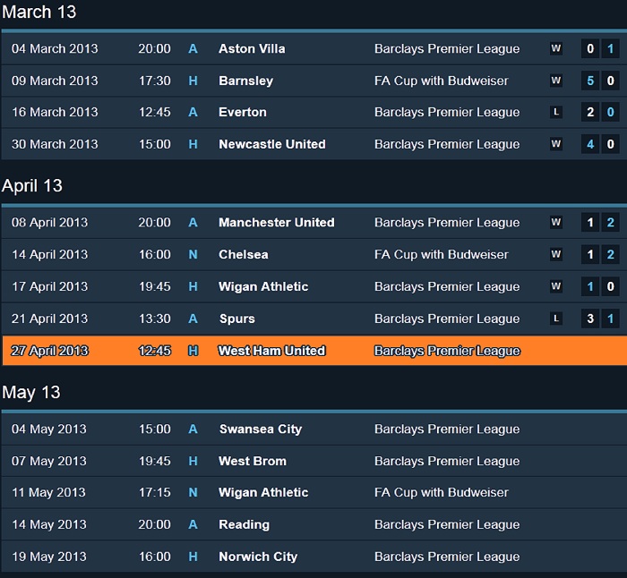 โปรแกรมและผลการแข่งขัน Manchester City ฤดูกาล 2012/2013