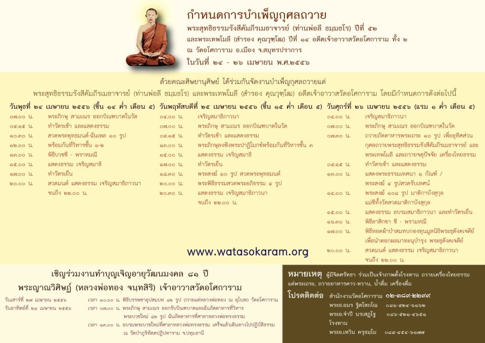 กำหนดการบำเพ็ญกุศลถวายท่านพ่อลี ปีที่ ๕๒ และพระเทพโมลี ปีที่ ๑๔