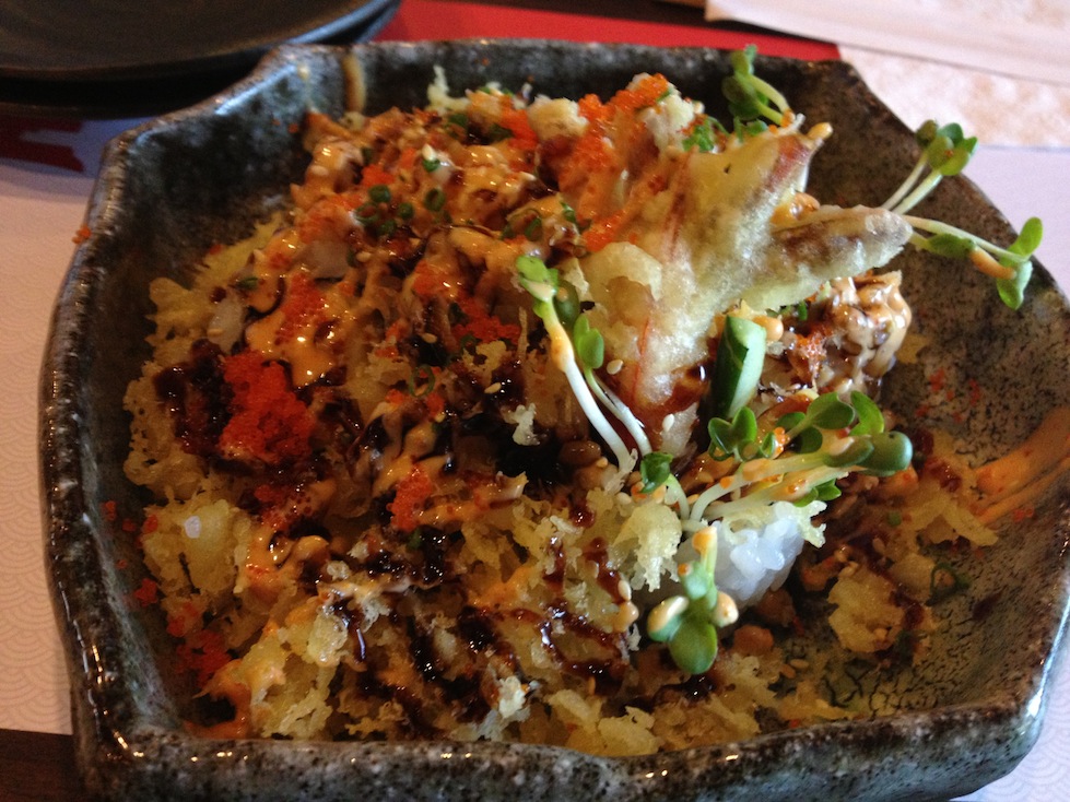 ต่อไป เมนูน้ำชอบมากกก เท็มปุระมากิ (โรลกุ้งเท็มปุระ) เขาเอาแป้งเท็มปุระมาโรยข้างหน้าจาน และแต่งด้วยไข่กุ้ง ราดด้วยน้ำซอลหวานๆ อร่อยแบบไม่ต้องจิ้มวาซาบิ