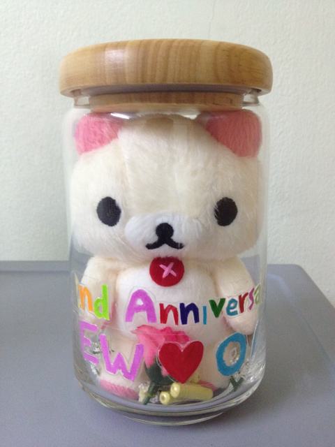 ซื้อตุ๊กตาการ์ตูนที่เขาชอบมา 1 ตัวครับ แล้วเอามาใส่ขวดโหล ภายในขวดโหล ตกแต่งด้วยของเล็กๆน้อยๆ แล้วก็ตัดกระดาษ(จะเป็นคำอะไรก็แล้วแต่) ระบายสี แล้ว เอาแปะไว้ข้างในขวดโหล เขียนขำใส่กระดาษ ม้วนๆใส่ในแคปซูลยา ใส่ลงไปในขวดโหลสัก 4 - 5 เม็ด ปิดฝา ผูกโบว์ เป็นอันเสร็จ