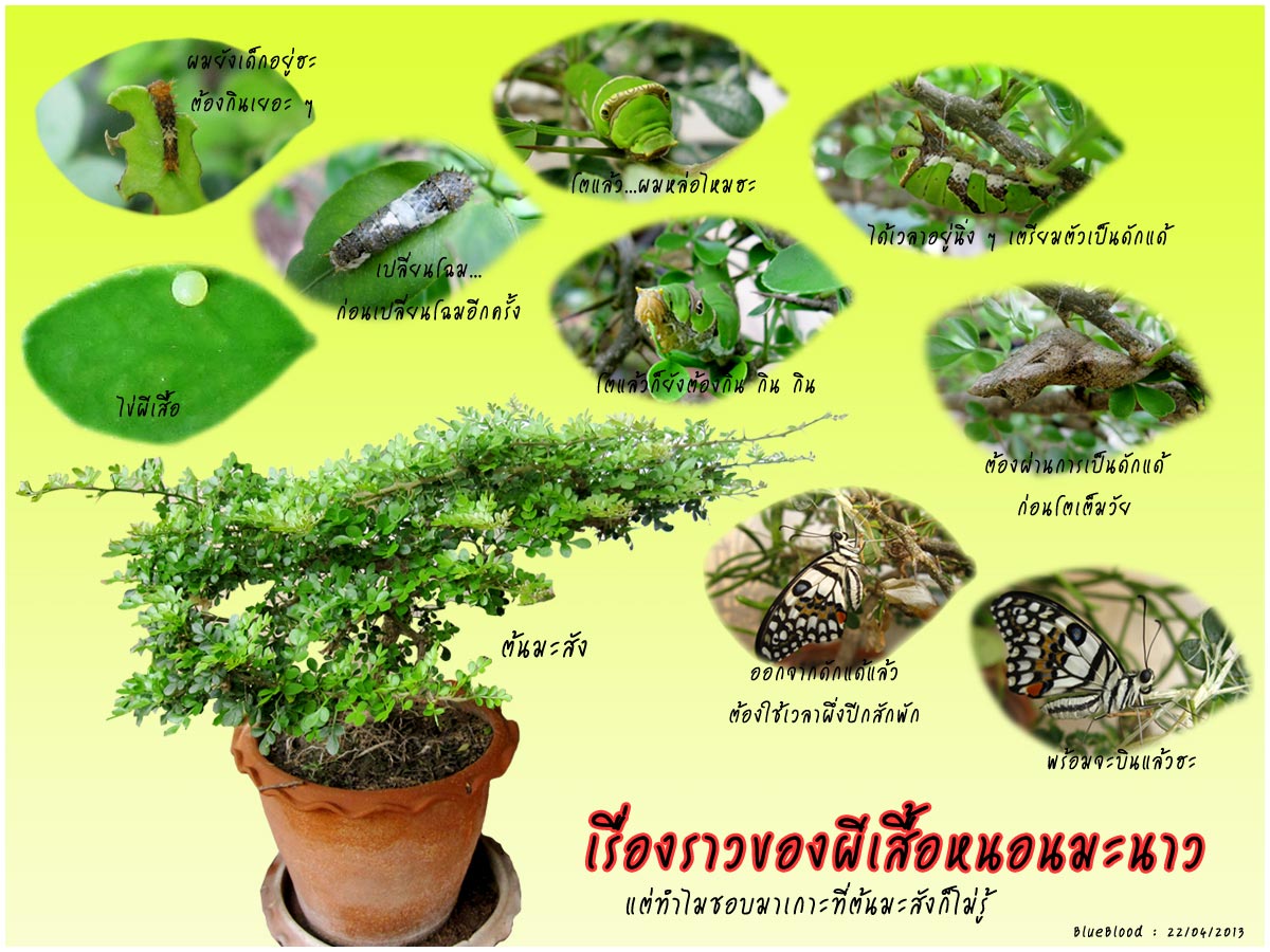 สืบเนื่องจากต้นมะนาวหลังบ้านถูกหนอนผีเสื้อเจ้ากรรมรุมกินใบมะนาวเสียจนเกือบเกลี้ยงต้น ไม่รู้ทำไงดี เลยเอาไปปล่อยกระถางต้นไม้หน้าบ้าน(คนอื่น) เห็นเค้าปลูกแต่ไม้ใบ ไม้ดอกคิดว่ามันคงไม่กิน ชะแว๊บผ่านไปว
