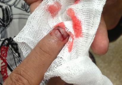 Pad Punk ปั่นลุยน้ำมา กลับมาล้างรถ ถอดโซ่ ล้างเฟืองอย่างดี ประกอบเสร็จลองหมุนล้อหลังฟรีดู แล้วเห็นฝุ่นตรงแถวแกนปลด เอานิ้วไปถูๆเช็ดๆ นิ้วดันเลยเข้าไปโดนใบดิสเบรคสับโช๊ะ ฮ่าๆๆๆ กระดูกแตก ถอดเล็บ ด้านล่างก็โดนใบดิสเด้งกลับมาสับ เย็บ3เข็ม ดีไม่หมุนแรงกว่านี้ อาจมีขาด