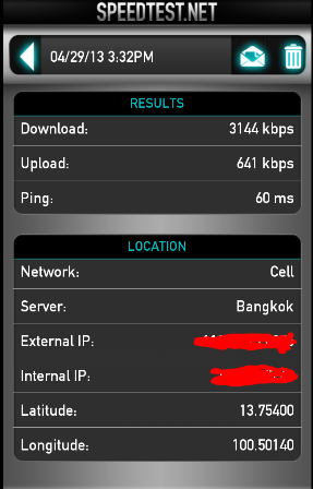 3. ระยะห่างระหว่าง cell site กับจุดทดสอบ หรือจำนวนผู้ใช้ในขณะนั้น น่าจะส่งผลให้ไม่สามารถใช้งานได้เต็มความเร็วสูงสุด (cell cid เดียวกัน จุดทดสอบเดียวกันแต่ความเร็วในการเชื่อมต่อไม่เท่ากัน)