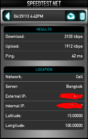 หลังปรับเป็น 3G ใหม่ ค่าที่ได้คือ 21xx/19xx kbps เห็นได้ว่าค่าดาวโหลดได้ตัวเลขน้อยกว่าก่อนปรับ แต่เมื่อเทียบกับค่าปกติพบว่าไม่แตกต่างจากก่อนปรับ แต่ค่าอัพโหลดเพิ่มขึ้นอย่างเห็นได้ชัด ขณะเดียวกันสังเกตุได้ว่า cell cid เปลี่ยนไปมา(จริงๆแล้วเปลี่ยนไปมาประมาณ 5 cid)และ Net type ก็เปลี่ยนเช่นกัน แต่อยู่ความเร็วอยู่ระหว่าง 7.2 - 21.6 Mbps และถ้าสังเกตุจะพบว่าที่จุดทดสอบเดียวกัน+cell cid เดียวกัน