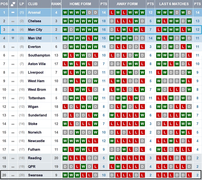 ตารางคะแนนเปรียบเทียบฟอร์ม 6 นัดล่าสุดของทุกทีมในพรีเมียร์ลีก