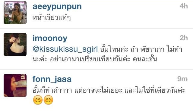 อั้มทำจมูก 1,000,000 เปอร์เซ็น และเธอก็ไม่ได้สูงส่งมาจากไหน ถึงจะต้องแบ่งชนชั้นกับดาราคนอื่น แฟนคลับนี่เยอะจริง ไรจริง ใครเกินหน้าหรือจะเทียบเท่าไม่ได้ และอีกอย่างดาราที่โดนเอามาเทียบเค้าอาจจะไม่อยากเหมือนอั้มก็ได้ เหมือนอั้มแล้วเท้าไม่ต้องแตะพื้นเหรอ ไม่ต้องใช้อากาศหายใจร่วมกับคนอื่นเหรอ ก็คนธรรมดาคนเท่านั้นเอง