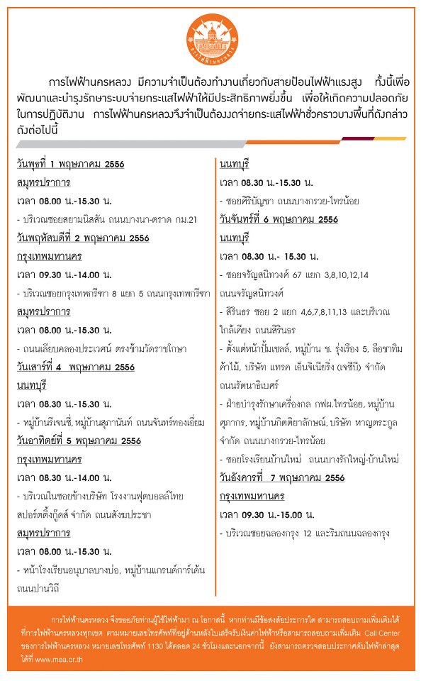 กฟน.ประกาศดับไฟฟ้าทำงาน วันที่ 01 - 07 พ.ค. 56 พื้นที่ดังต่อไปนี้