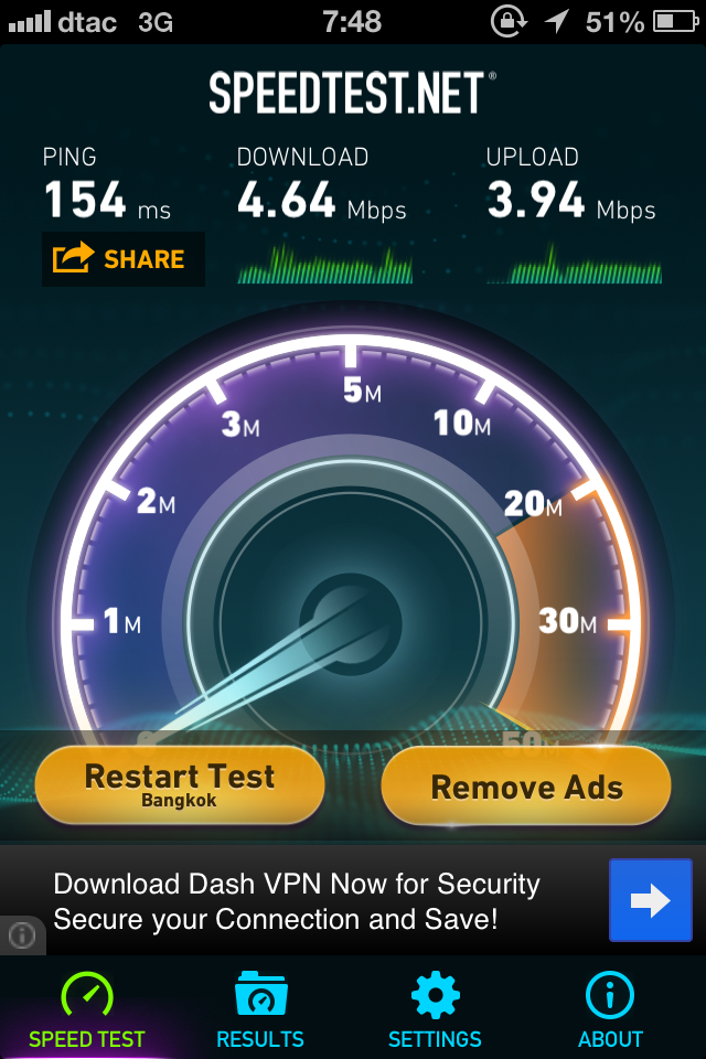 ทดสอบบริเวณ ห้าแยกพ่อขุนฯ โดย iPhone3GS ใช้โปร NETT299 (FUP 2GB หลังจากนั้นเหลือ384K ใช้โทรออกไม่ได้ รับสายไม่ได้ smsไม่ได้ mmsไม่ได้ ใช้ได้แต่เน็ตอย่างเดียว) ทดสอบเวลา ประมาณเที่ยงคืน 25 มี.ค. 56