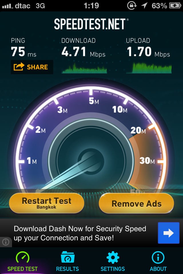 ช่วงต้นเดือน ปลอด FUP เลยมีเวลาว่างทดสอบความเร็ว 3G กันครับ พื้นที่ใช้งาน : ซอยวัดลาดปลาดุก อำเภอบางบัวทอง จังหวัดนนทบุรี เครื่องมือทดสอบ : ZTE MF62 MIFI Router 850/2100 21Mbps ความแรงของสัญญาณ : เ