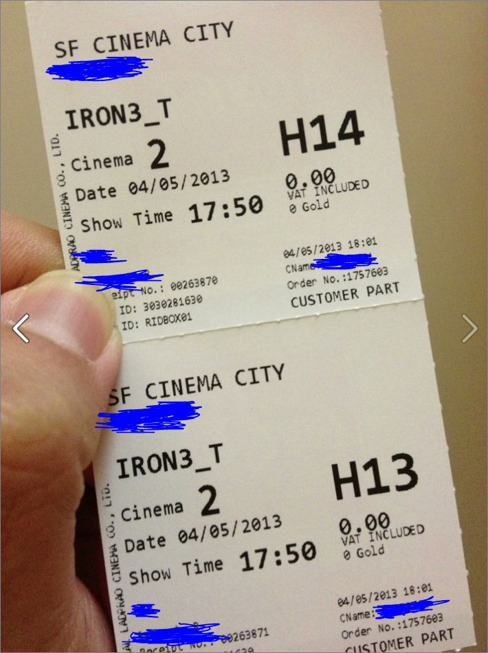 เรื่องมีอยู่ว่า เมื่อวันเสาร์ที่ 4 พ.ค. 56 ผมกับเพื่อนไปดู IRON MAN 3 กันที่ ห้างดังแห่งหนึ่ง ย่านรามอินทรา (ไม่ขอเอ่ยชื่อห้างเพราะคงเป็นที่รู้กัน) รอบ 17.50 น. โรงที่ 2 ที่นั่ง H13 และ H14 ตอนที่เราจะเข้าไปในโรงนั้น หนังตัวอย่างเริ่มฉายแล้ว พอได้ที่นั่งเรียบร้อยก็ดูหนังไปตามปกติ (หนังสนุกมากครับ) พอหนังจบเราก็เดินออกมา (เวลา 20.11 น. จำแม่นเลย) และแวะเข้าห้องน้ำบริเวณจุดขายบัตรชมภาพยนตร์ เพื่อนผมขอตัวเข้าห้องน้ำ ผมจึงรออยู่บริเวณนั้นสัก 2-3 นาที ก็มีผู้ชายคนหนึ่ง อายุประมาณ 35-40 สวมเสื้อยืดคอกลม กางเกง 3 ส่วน (ตามภาพ) เข้ามาถามผมว่า