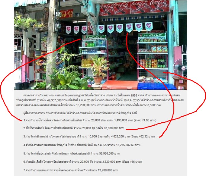 1. ค่าตกแต่งร้านที่ให้ร้านละ 3,000 บาท จำนวน 10,000 ล้าน ก็เป็นเงิน 30 ล้านบาท