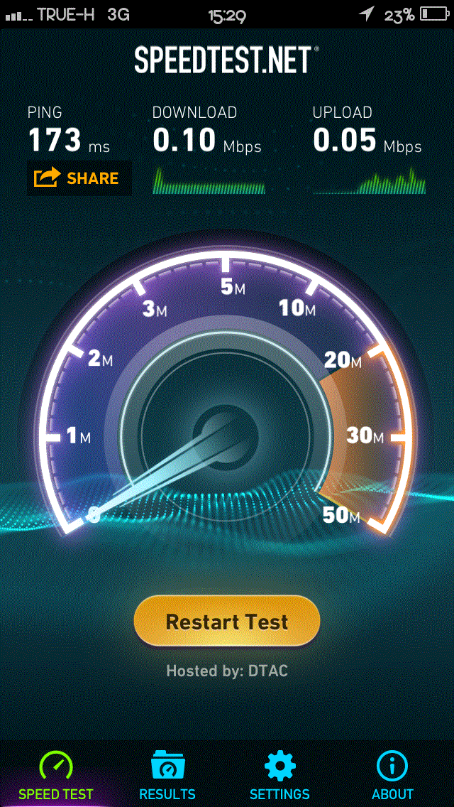 อันนี้ความเร็วของ DTAC 3G 850 อันนี้ความเร็วของ DTAC TriNet 2100 ถ้าไม่เห็นตัว H+ นึกว่าใช้ EDGE 2G อยู่นะนี่ บริเวณ ซอยพิบูลย์สงคราม 22 ใกล้สะพานพระราม 5 ครับ เป็นแบบนี้มาเกือบสองปีแล้ว คืนนี้ผม