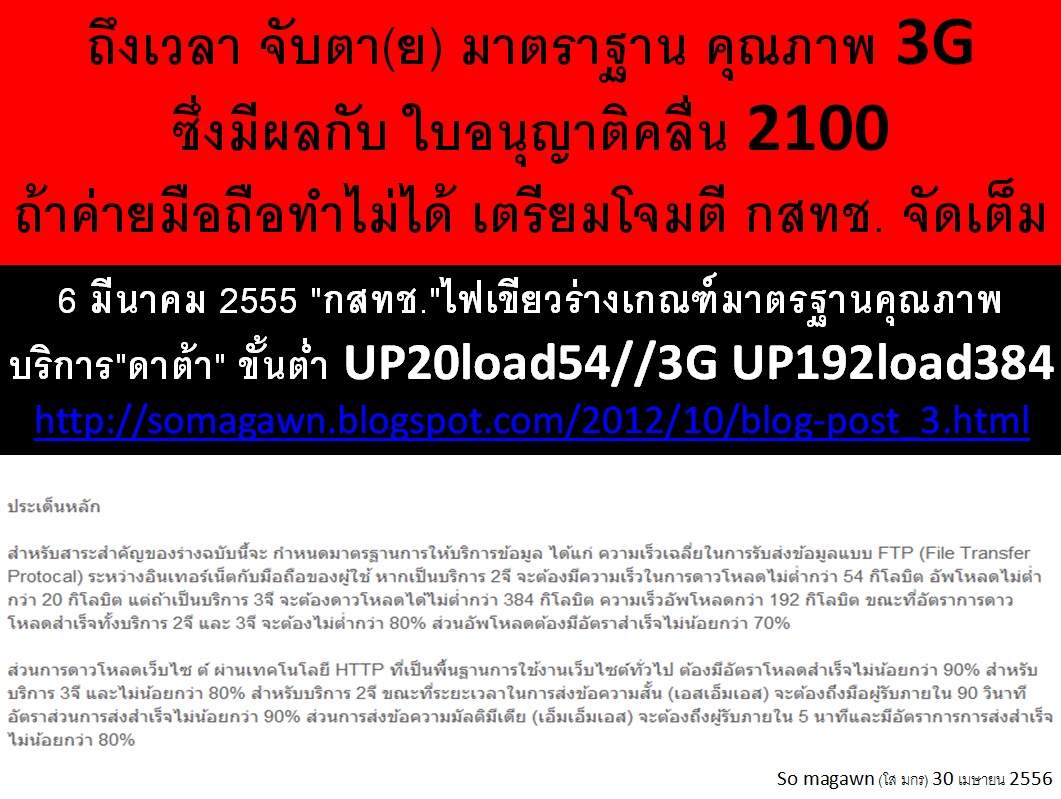 7 พฤษภาคม 2556 (AISเลี่ยงไม่ตอบมาตรฐาน3G LOAD 384K) (ยันไม่นอกเหนือระเบียบ) ลดราคาเพิ่มปริมาณแน่นอน++ ไร้ปัญหาร้องเรียนจากลูกค้า ++3G 2100 เป็นมาตรฐานโลก ต่างจาก 900 หรือ 850 ที่ใช้กันแค่บางประเทศ