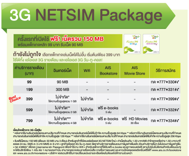 นอกจากนี้ก็ยังมีแพกเกจเน็ตซิมเริ่มต้นที่ 99 บาท ใช้งานได้ 90 MB ไปจนถึง 799 บาท ไม่จำกัดที่ความเร็วสูงสุด 4 GB ฟรีไว-ไฟ e-books 5 เล่ม และ HD Movies 30 เรื่อง หรือแพกเกจค่าโทร.รายเดือนปกติ เริ่มต้นที่ 200 บาท โทร.ทุกเครือข่าย 230 นาที ไปจนถึง 1,500 บาท โทร.ทุกเครือข่าย 2,000 นาที