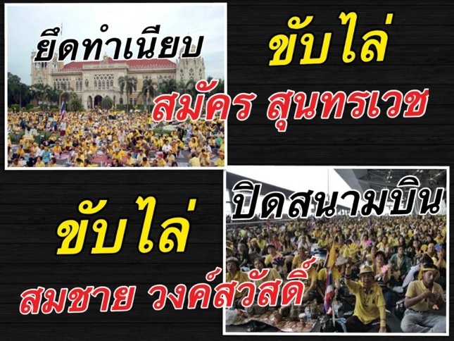 ใช้ทหารปฏิวัติรัฐประหารยึดอำนาจ ทักษิณ ชินวัตร ใช้เสื้อเหลืองยึดทำเนียบขับไล่ สมัคร สุนทรเวช ศาลรธน.ช่วยปลดนายสมัครให้ ด้วยข้อกล่าวหา ทำกับข้าว ใช้เสื้อเหลืองปิดสนามบินขับไล่ สมชาย วงค์สวัสดิ์ ศาลรธน.