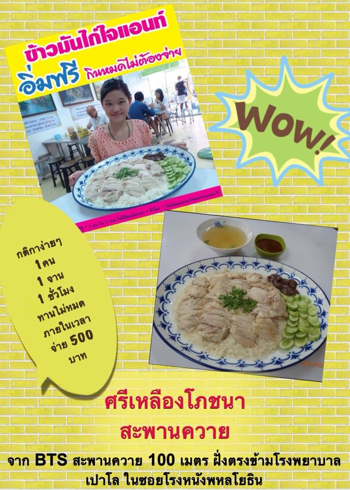 เจอมาครับ เผื่อใครอยากกินฟรี ช่วงนี้เศรษกิจไม่ดีต้องประหยัดกันหน่อย... ข้าวมันไก่ไจแอนท์ ข้ามมันไก่ร้อนๆจานยักษ์ใหญ่ ใส่มาเต็มๆ ที่ ร้านศรีเหลืองโภชนา สะพานควาย (ซอยโรงหนังพหลโยธินรามา) ร้านที่เปิด